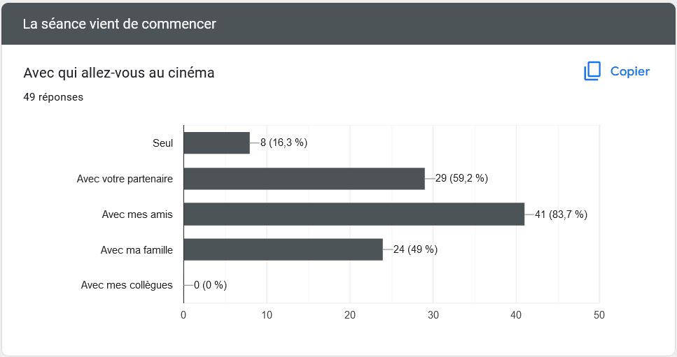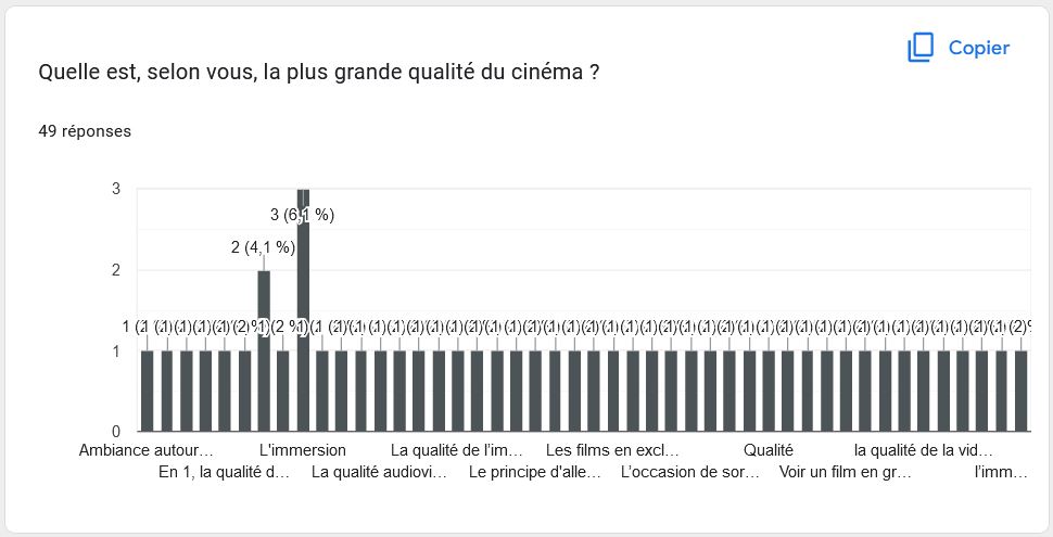 Les résultats de cette question favorises l’idée que le cinéma est un art / divertissement collectif.