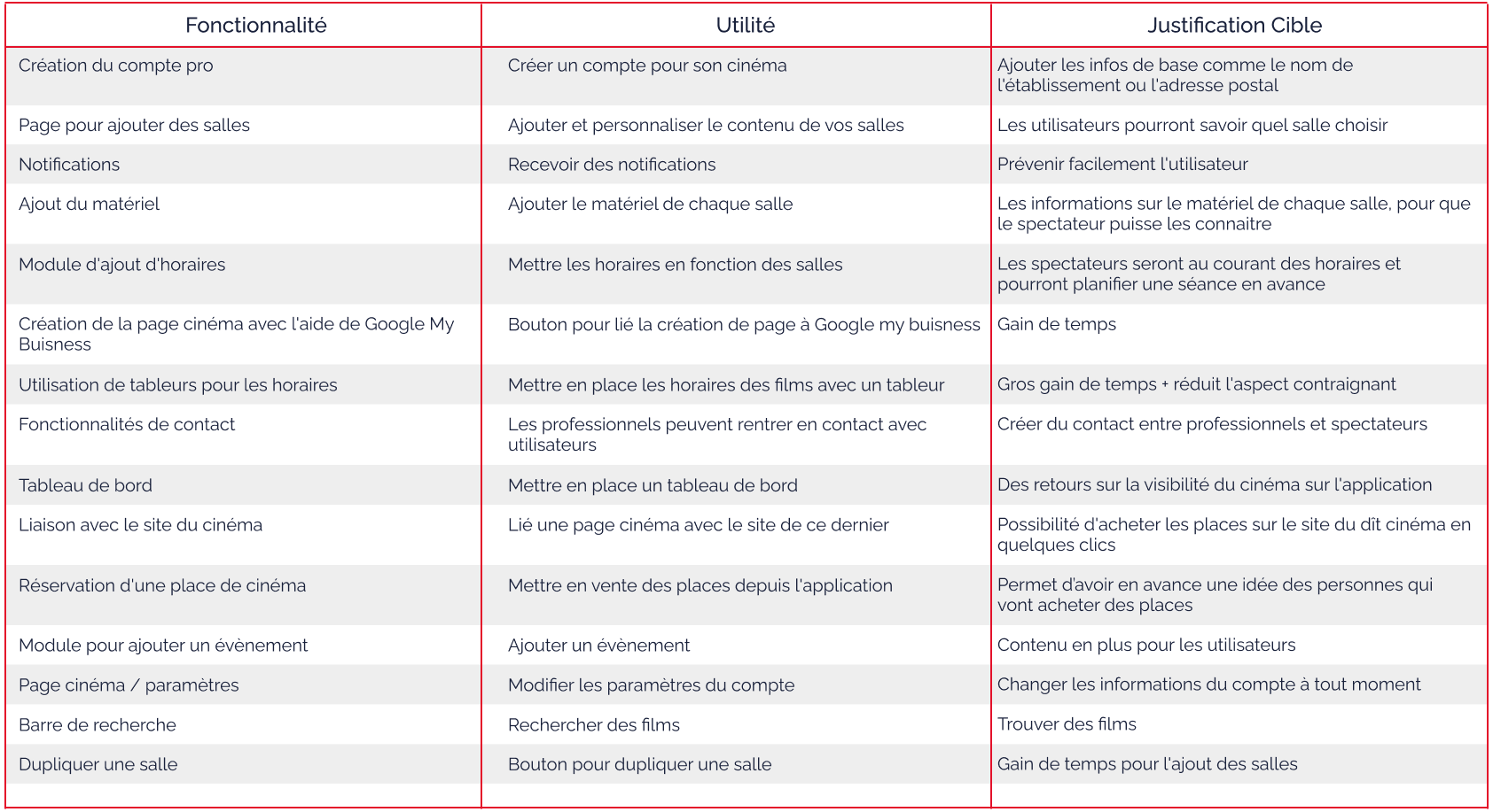 Pour les professionnels, l’application devrait offrir des outils de création et gestion des salles et des séances, donner la possibilité d’ajouter facilement du contenu, rentrer en contact direct avec les spectateurs et intégrer avec des services externes comme Allociné ou Google My Business.