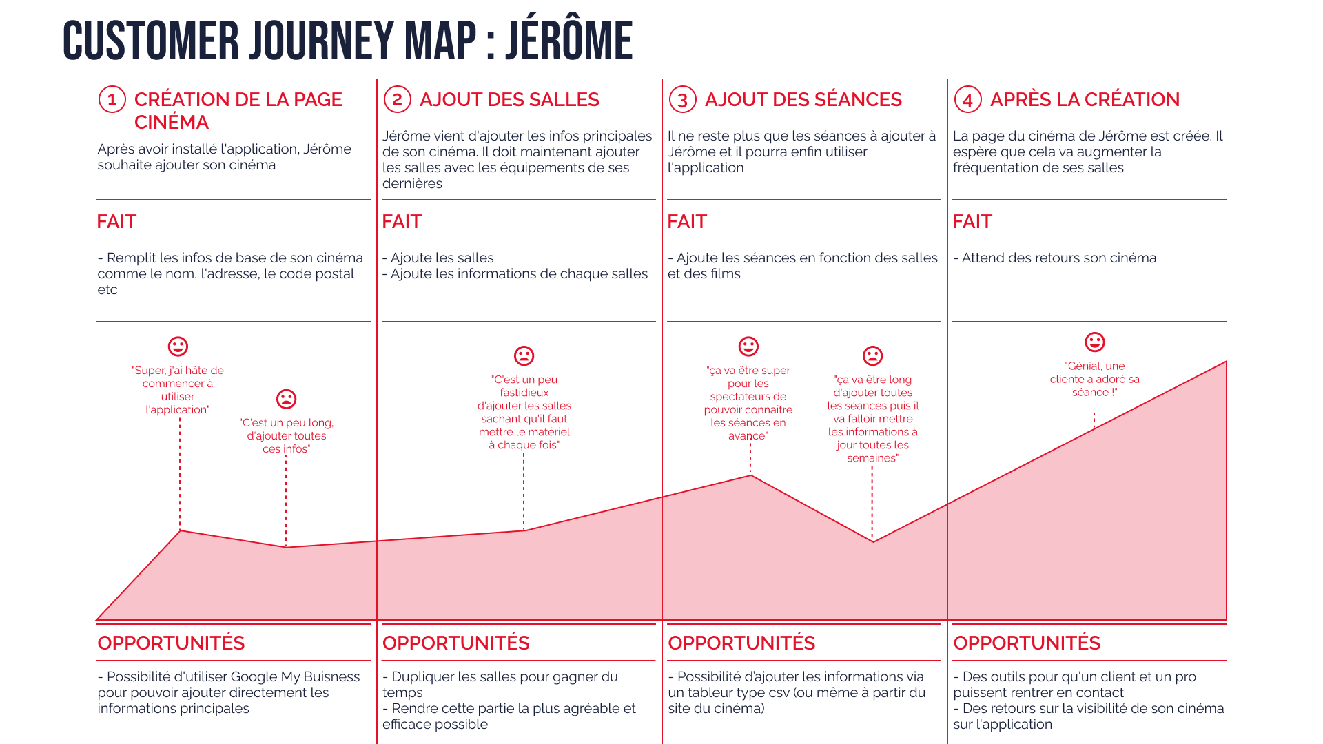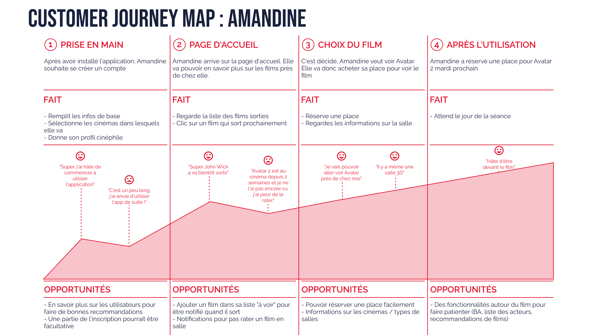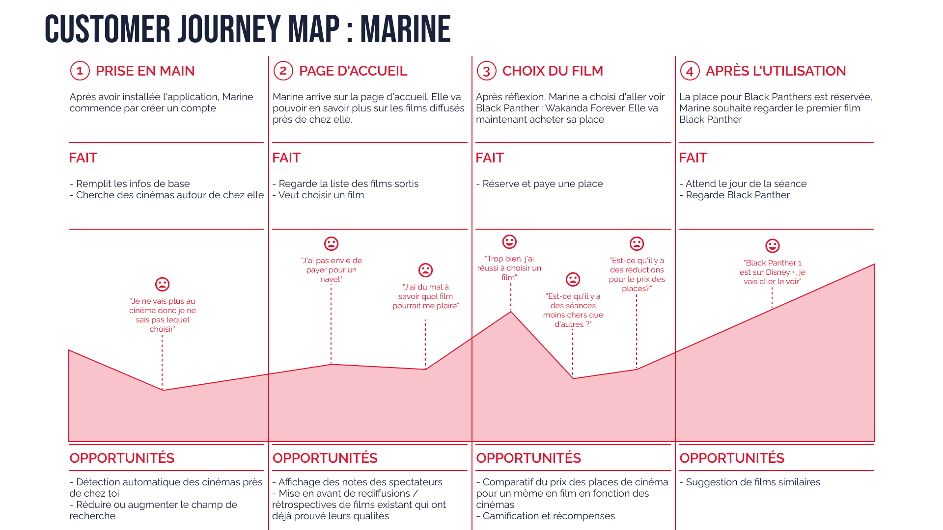 À partir des données collectées précédemment, j’ai créé 3 personas, enrichis de cartes d’empathie et de customers journey maps, qui m’ont permis de mieux cerner les motivations, frustrations et attentes de chaque type d’utilisateur, et de guider la conception de l’application.