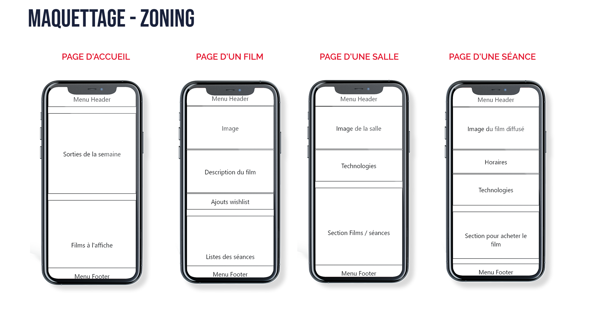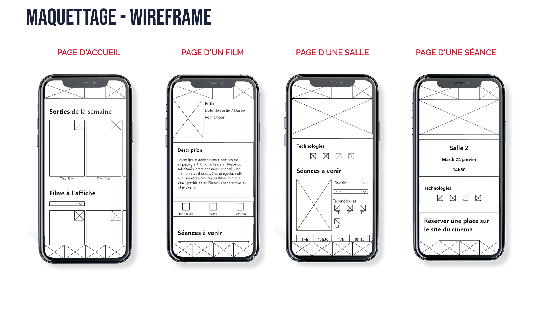 Ce que j’avais appris au cours de la recherche utilisateur m’a convaincu de créer une application qui mettrait en avant, pour les spectateurs, la diversité d’options et d’expériences du cinéma (différentes technologies, types de séances), mais aussi les évènements locaux autour du cinéma (rétrospectives de films, séances spéciales).