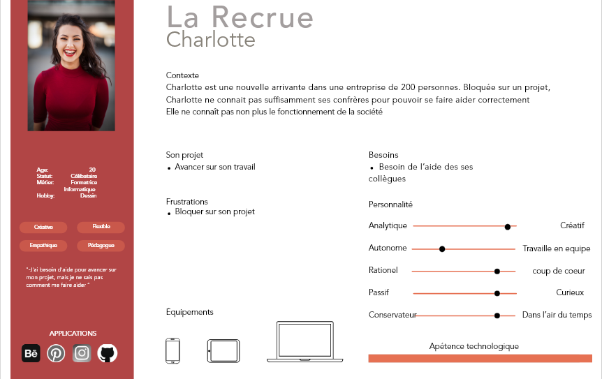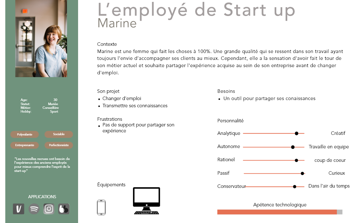À partir des résultats du questionnaire, nous avons conçu des personas distincts pour représenter différents profils d’utilisateurs et leurs besoins spécifiques. Ces personas nous ont permis d’anticiper les usages variés de l’application et de concevoir des fonctionnalités adaptées à chacun.