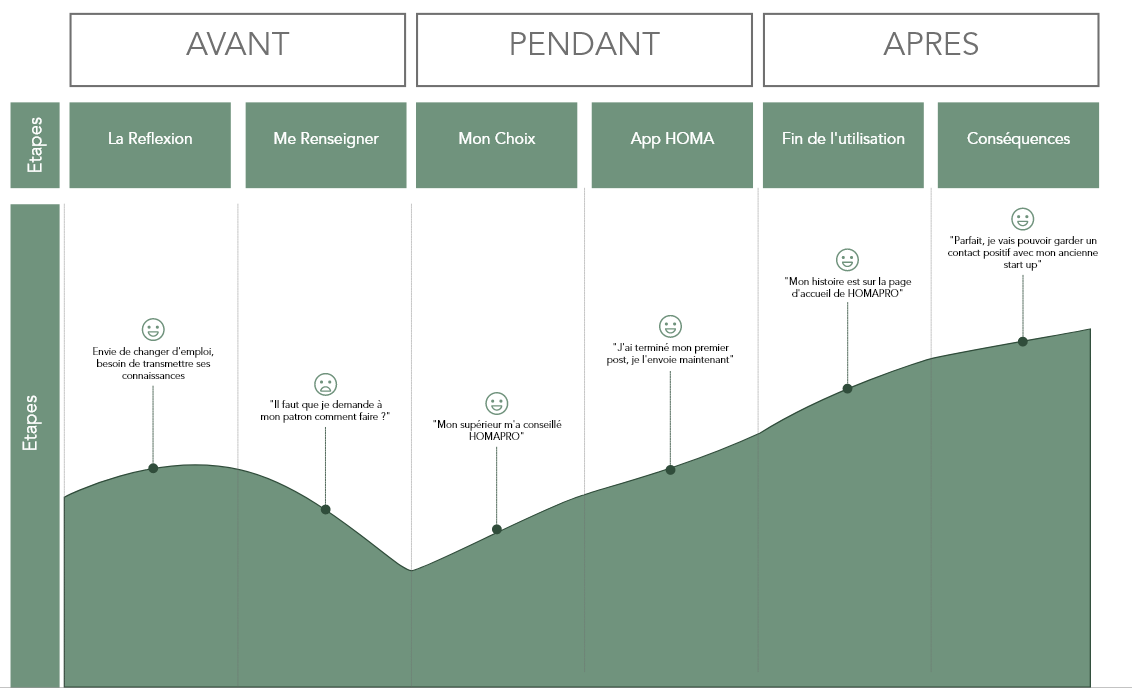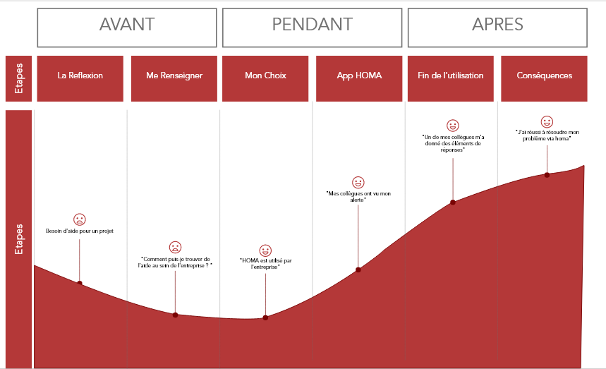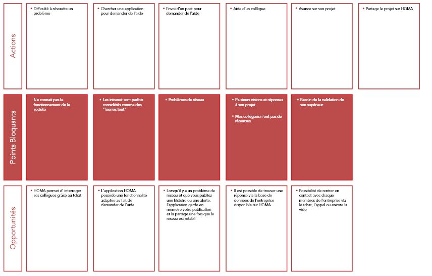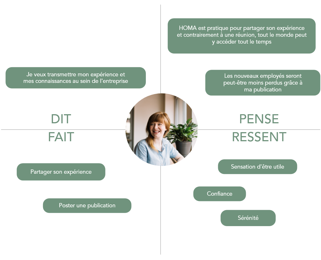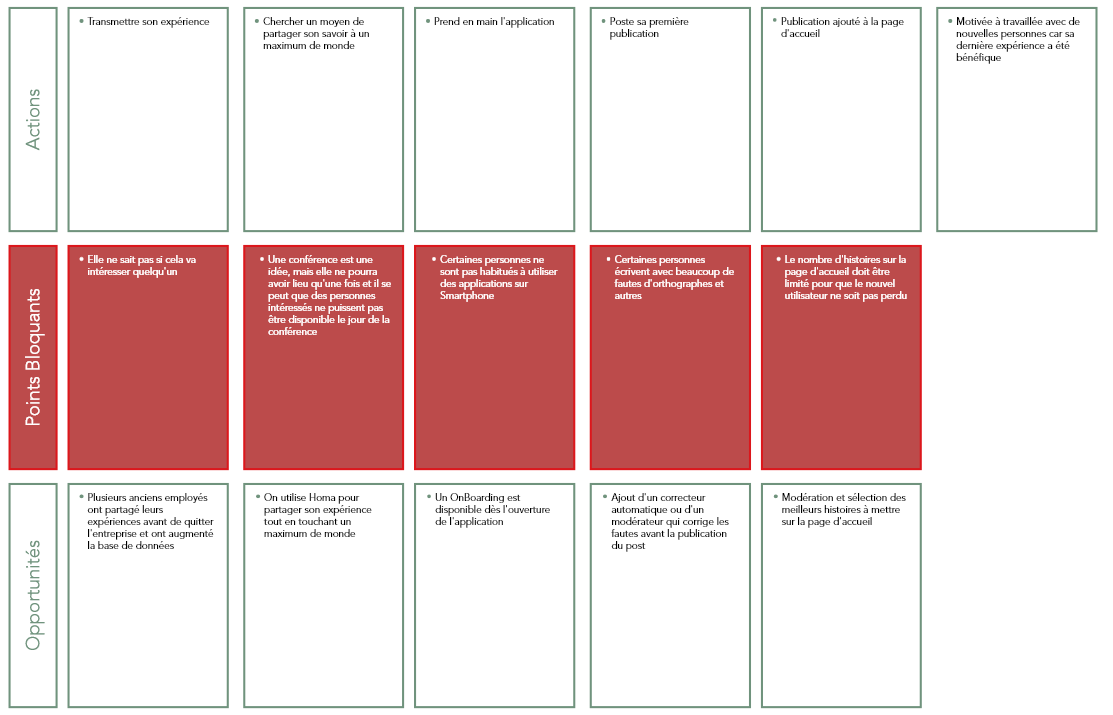 Pour approfondir leur parcours, nous avons élaboré une Experience Map pour chaque persona afin d’identifier leurs actions, points de friction et opportunités offertes par l’application. Nous avons également réalisé des Empathy Maps afin de mieux comprendre leurs émotions et motivations.