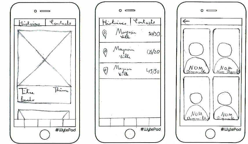 Nous avons présenté nos esquisses lors d’un tour de table puis regroupé et synthétisé les meilleures idées pour produire un sketch commun, servant de première ébauche de maquette pour l’application.