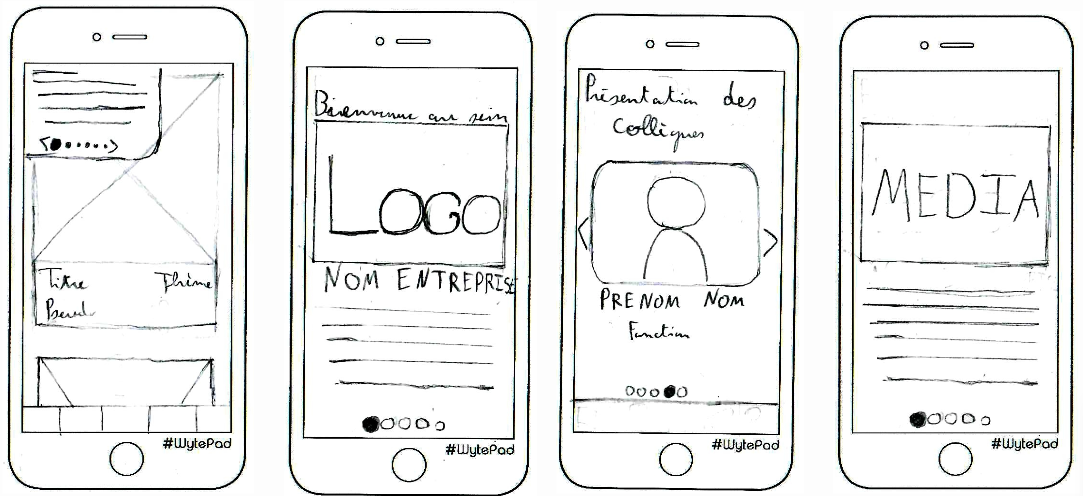 Nous avons mené un atelier de co-sketching, visant à impliquer l’équipe dans la conception visuelle de l’application. Chaque participant a reçu un gabarit de smartphones sur lequel dessiner les écrans et fonctionnalités imaginés, afin de proposer une première vision de l’interface.