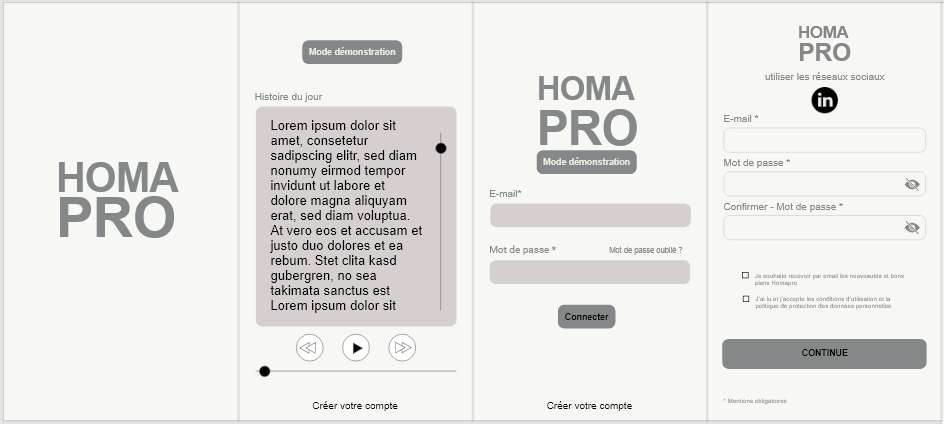 Une fois les wireframes validés, nous avons finalisé la maquette interactive de l’application en y intégrant la charte graphique de HOMA, les couleurs, des images illustrant les histoires ainsi que des photos de profil pour incarner les utilisateurs.