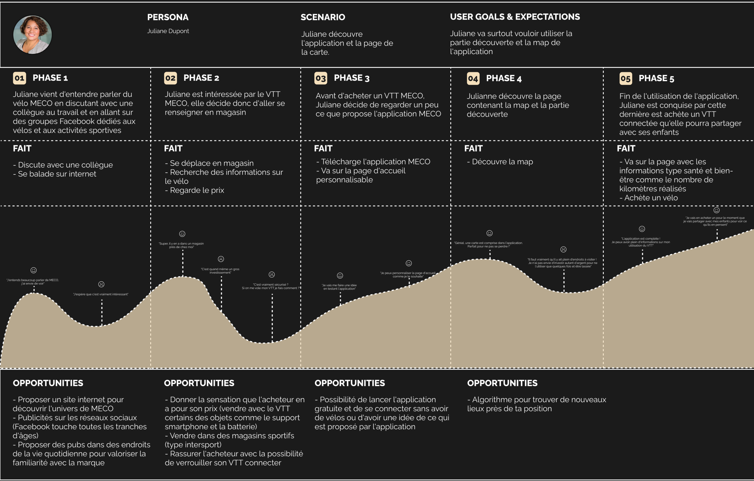 L’application MECO est au cœur du projet. Elle permet non seulement de connecter et sécuriser le vélo (via un verrouillage), mais aussi d’accompagner l’expérience de l’utilisateur avec une carte GPS intégrée, des statistiques santé et bien-être, une page d’accueil personnalisable et un algorithme de découverte de parcours. Elle a été pensée pour être utile même sans posséder un vélo MECO, permettant ainsi de séduire de nouveaux utilisateurs potentiels.